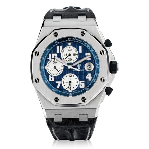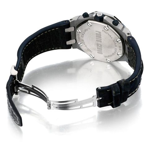 Audemars Piguet Royal Oak Offshore Limited Edition is stainless steel. Porto Cervo.44mm case size. Blue dial. Integrated Blue horseback strap. Automatic movement. Chronograph.Sapphire crystal.Limited edition to 75. This watch was produced in honor of its boutique store in the seaside resort of Sardinia. Its functions are:Hours:minutes:seconds:Date and Chono.