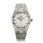 Ladies Audemars Piguet Royal Oak wristwatch in stainless steel. Integrated stainless steel bracelet with fold over clasp. Case size: 33mm. Bezel is set with 32 x 0.65 total carat weight of Brilliant cut diamonds.Beautiful silver toned "Grande tapisserie" pattern dial. Date. Circa 2011.Ref: 67621ST.