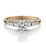 Ladies 14 and 18kt yellow gold Birks diamond vintage engagement ring featuring a 0.60 carat Old-European cut diamond of (VVS) in clarity and (F) in color. Further enhanced by 6 x 0.15 carat total weight of Round Brilliant cut diamonds. Circa 1950's. Currently a finger size 7 3/4 but can be resized.