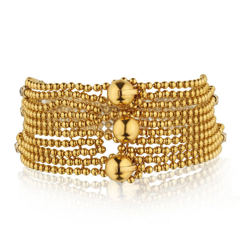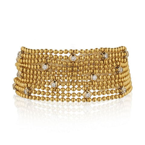 Ladies 18kt yellow gold Cartier "Draperie De Collete" bracelet . This bracelet features 17 Brilliant cut diamonds bezel set in 18kt white gold of (VVS) in clarity and (E-F) in colour. 10 rows of 18kt yellow gold beads. 3 button closure with security chain. Length:7 inches. (W) is 1 inch. Weight:53 grams. Circa 1990's.
