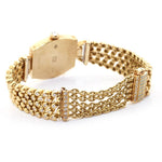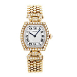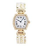 Ladies rare 18kt yellow gold and diamond tonneau-shaped Cartier wristwatch featuring a removable 18kt yellow gold and diamond-set bracelet, as well as an additional bracelet with five rows of pearls and gold beads. Off-white dial with black roman numerals and blued steel hands. Bezel and lugs are set with round brilliant cut diamonds; diamond-set crown. 22.5mm x 22.5mm case. Signed Cartier, Paris. Manual-winding movement. Circa 1995.
