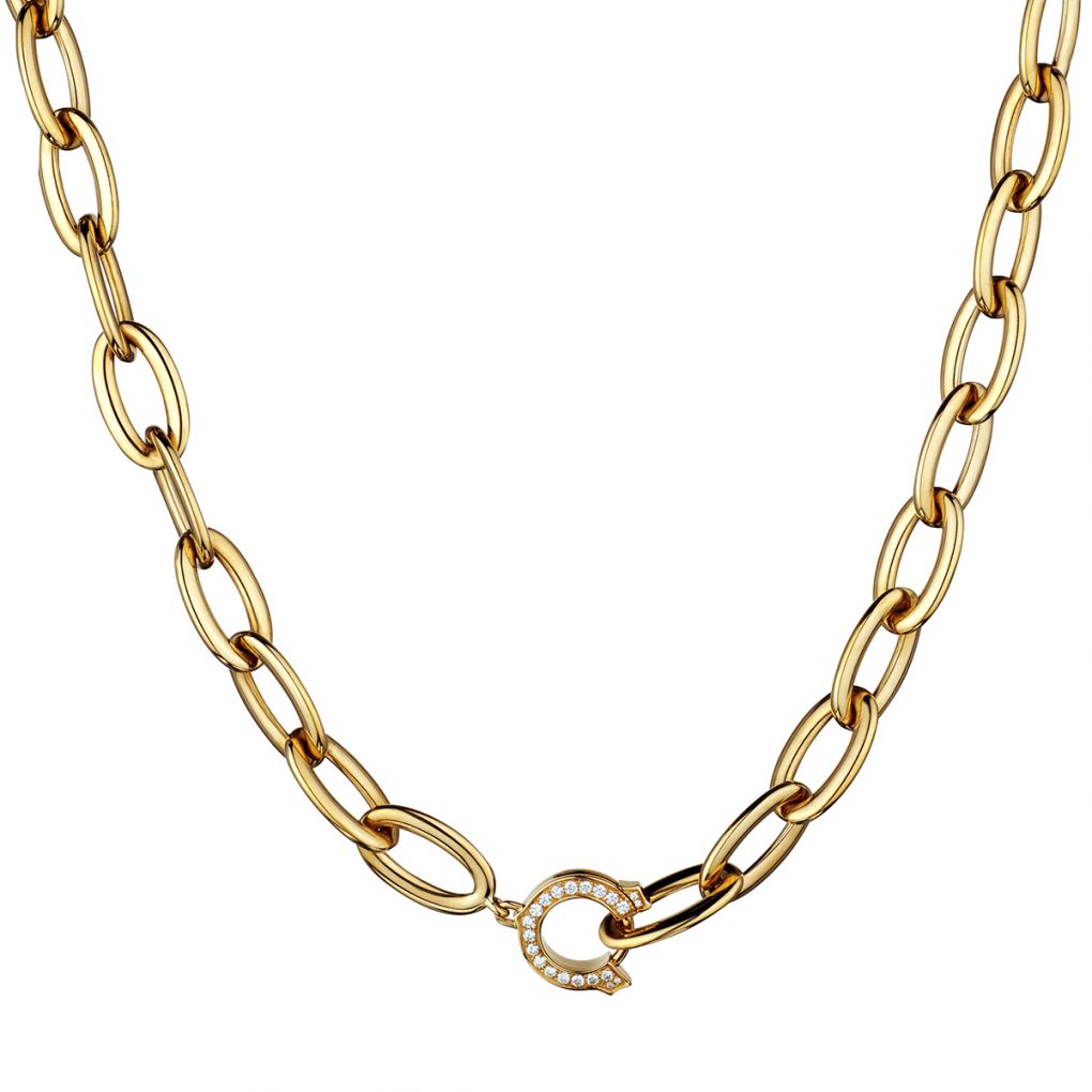 Cartier 18kt yellow gold oval link chain with "C" diamond clasp. Oval looks measure 17mm wide . The closure of this magnificent chain is a "C" set with Brilliant cut diamonds . Weight:84.8 grams. Length:20 inches. This necklace is discontinued.