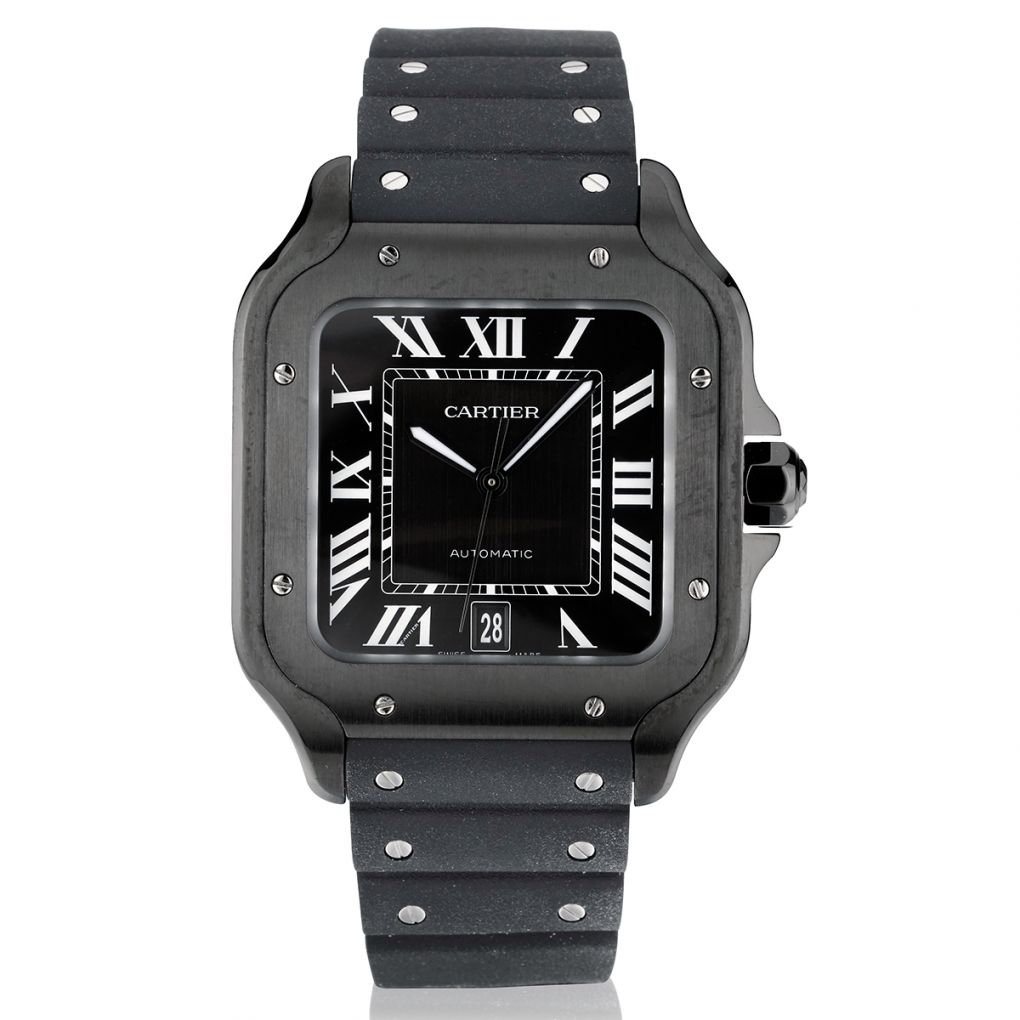 Cartier Santos De Cartier Large.ADLC Black case. Black dial with Roman numerals..Rubber band with fold over clasp. Accompanied by an extra black alligator band.39.8mm x 9.38mm case size. Sapphire crystal. Caliber:1847:23 Jewels.Water resistant :100m. Circa 2021.