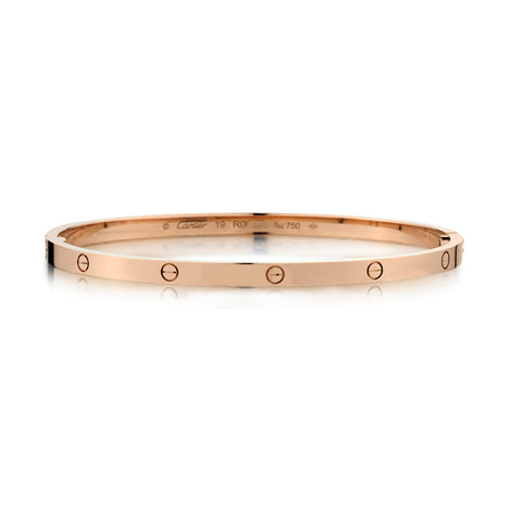 • Cartier Small Model Love Bangle in Rose Gold. Size 19. B&P