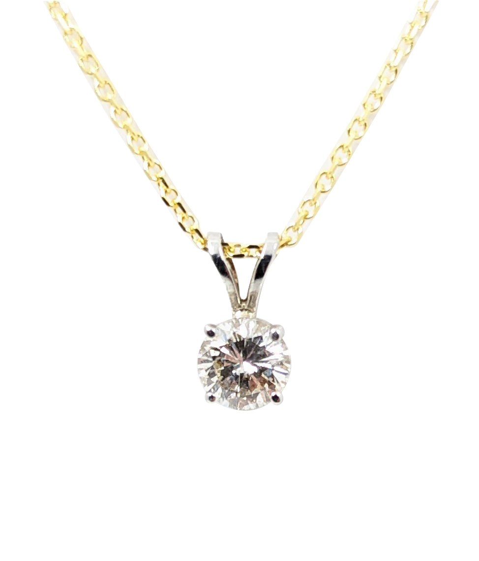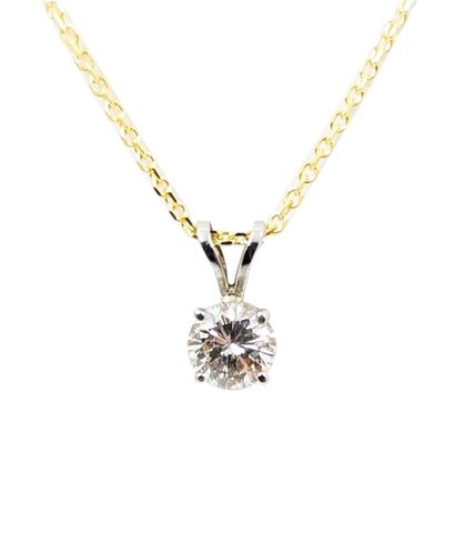 Ladies 14kt yellow gold Natural diamond solitaire pendant. This pendant features a natural  Brilliant cut diamond weighing 0.98 carat weight of (G) in colour and (I-1) in clarity. Four prong setting. 14kt yellow gold box chain measuring 16" in length.