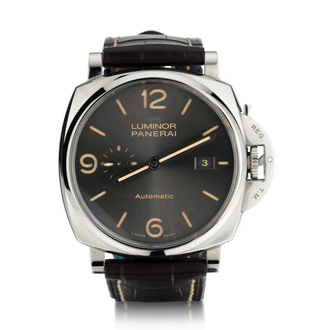 Gents Panerai Luminor 3 day in stainless steel. Accompanied by the original Panerai Brown leather band with steel panerai tang. Beautiful grey anthracite dial. Automatic movement. Sapphire crystal. Exhibition back.Case size 45mm.Thickness:10.05 mm .Water resistant:30 metres.Calibre:P4001.Jewels:31. Power reserve indicator. Power reserve:72 hours. 278 components.