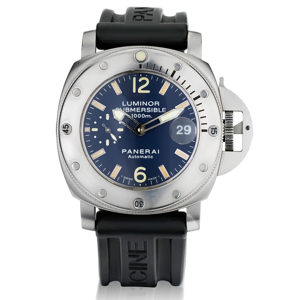 Gents stainless steel Panerai Submersible wristwatch. Cushion shape. Limited Edition to 500 pieces. Black rubber band and accompanied by an extra Panerai black cloth strap. Sapphire crystal. 44mm x 18mm case size.Automatic movement. Date. Dark midnight blue tritium painted dial. 21 Jewels. 42 hr power reserve. Water resistance 1,000 metres. Automatic movement. F series. Circa 2003. Original Panerai tang. Discontinued.