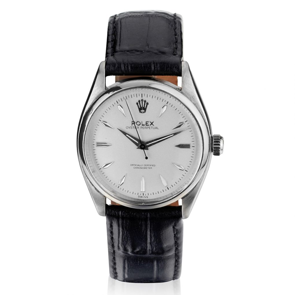 Rolex Oyster Perpetual "Iconic classic "steel wristwatch. Oyster Perpetual . White dial with silver hands. Caliber 1030. 34mm case measurement. Automatic movement.Plexiglass. Circa 1958.Black leather band. Reference: 6564