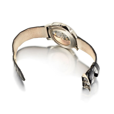 Gent's 18kt white gold Girard Perregaux 1966 Automatic wristwatch. Fixed 18kt white gold bezel. Silver dial with silver-tone hands and index hour markers; annual  calendar- day and date display above center dial; date and moon phase sub-dial at the 6 o'clock position. Automatic movement. Sapphire crystal. Skeleton caseback. 40mm case diameter; 10.7mm case thickness. Black leather strap with tang clasp. Reference #: 49535
