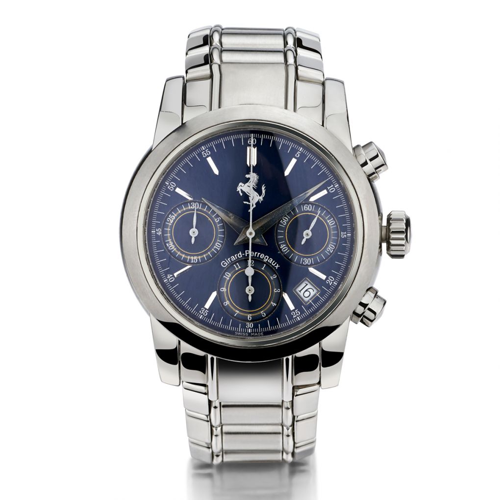 Gent's stainless steel Girard Perregaux Ferrari chronograph wristwatch. Automatic movement. Original integrated stainless steel bracelet. 38mm case diameter. Blue dial with chronograph subdials; date display between the 4 and 5 o'clock position. Manufactured specifically for Ferrari. Sapphire crystal. Year 2001. Reference #: 8020.