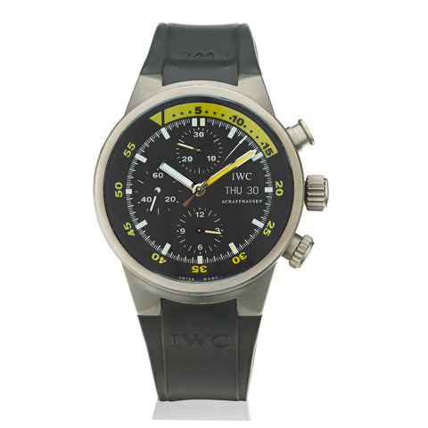IWC Titanium Aquatimer  chronograph. Day-Date.Integrated rubber band with IWC tang. Black and yellow dial with luminous numerals and luminous indices. Case size: 42mm. Automatic movement. Power reserve: 44 hours. Water resistance: 10 ATM. Purchased 2005. Ref: 371918.