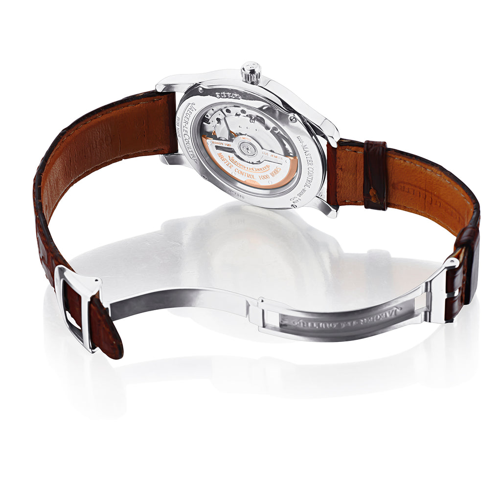 Jaeger Le Coultre Master Control Date. Stainless steel. Brown leather band with JLC deployant buckle. Case size: 40mm x 48 mm.Silver dial with Arabic numerals.  Automatic movement. Calibre: 889. Jewels: 32. Date. Exhibition /Skeleton back.Purchased: 2007.