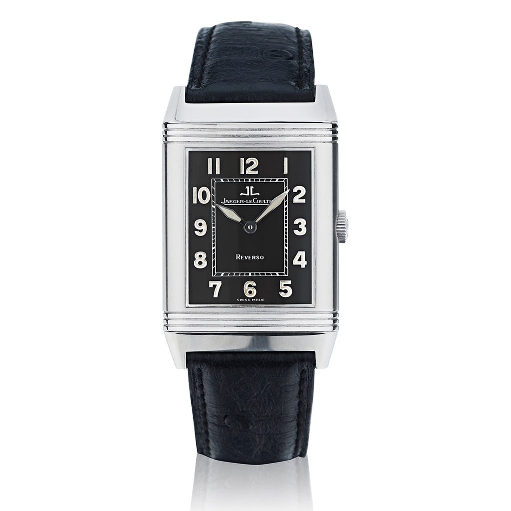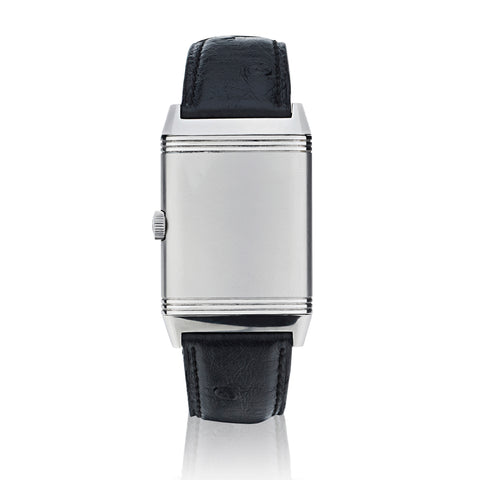 Unisex Jaeger le Coultre  Reverso wrist watch in stainless steel. Black leather band with JLC steel tang. Case size: 26mm x 42mm. Grey Dial with Arabic numerals. Manual winding. A true classic.