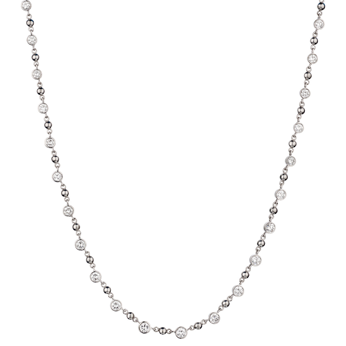Ladies 14kt white gold diamond necklace featuring 31 x 3.00 total carat weight of Brilliant cut diamonds of (VS) in clarity and (G) in colour. These diamonds are set in a bezel setting. Secure lobster clasp closure. This chain measures: 15" (L). Weight: 12.3 grams.