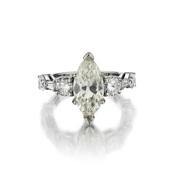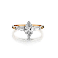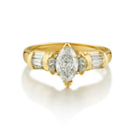 Ladies 14kt yellow gold diamond ring featuring a Marquise cut diamond weighing 0.75 carat weight of (SI-1) in clarity and (E) in colour. Also featuring 2 x 0.10 total carat weight of Marquise cut diamonds. Also featuring 6 x 0.25 total carat weight of Baguette cut diamonds. Current finger size is 7-1/2. This ring can be resized.