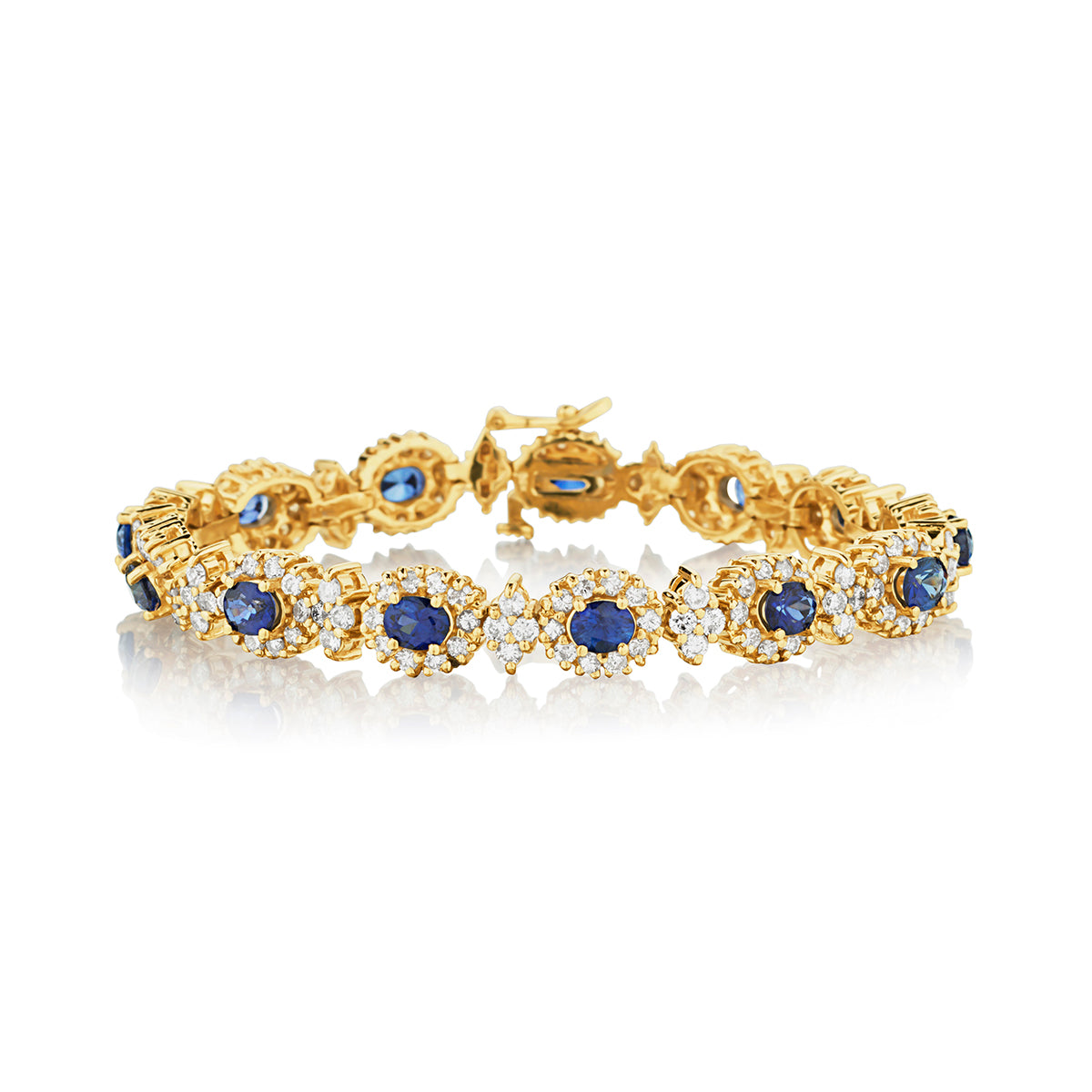 Ladies 14kt yellow gold Blue Sapphire and Diamonds cluster bracelet. This beautiful bracelet features 13 x 6.50 total carat weight of Oval Blue Sapphires. Also featuring a halo of 182 x 4.50 carat total weight of Brilliant cut diamonds of (SI) in clarity and H-I in colour.  9mm(W). 7 inches (L).