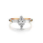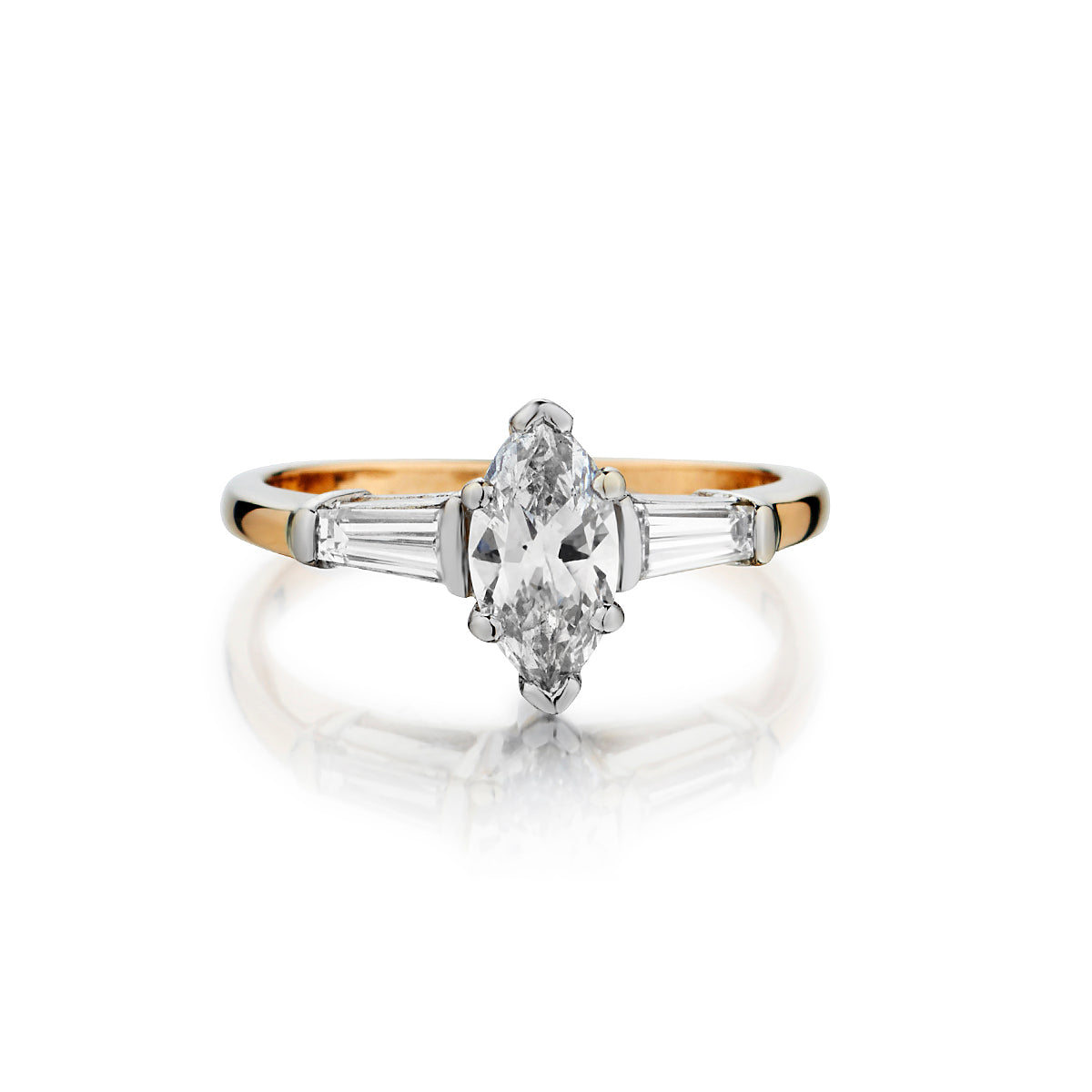 Ladies 14kt Yellow and white gold diamond ring featuring a natural Marquise cut diamond weighing 0.70 carat weight of (Si-2) in clarity and (E) in colour. 2 x tapered baguettes. Current finger size 4-3/4. This ring can be resized.
