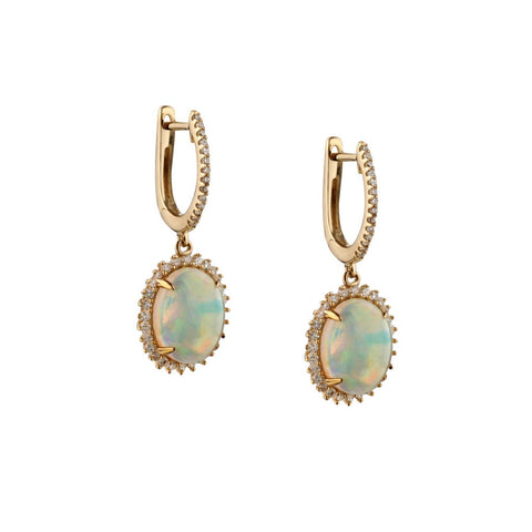 Ladies 14kt yellow gold Opal and Diamond drop pendant earings featuring 2 x oval Opals surrounded by a halo of Brilliant cut diamonds. Post and hook like closure. 26mm (L). Elegant for daywear or nightwear.