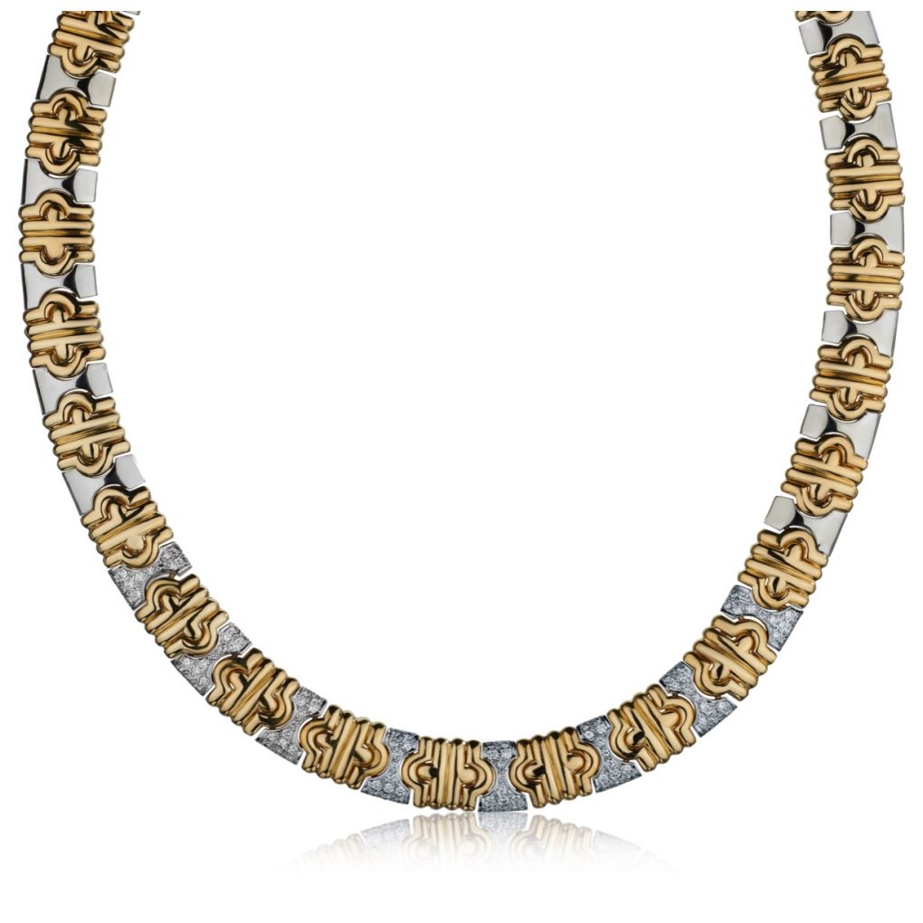 Ladies 18kt yellow and white gold Bvlgari style choker necklace. This necklace features 104 x 2.50 total carat weight of brilliant cut diamonds of (VS) in clarity and (G) in colour. Length:18".Weight:122 grams.