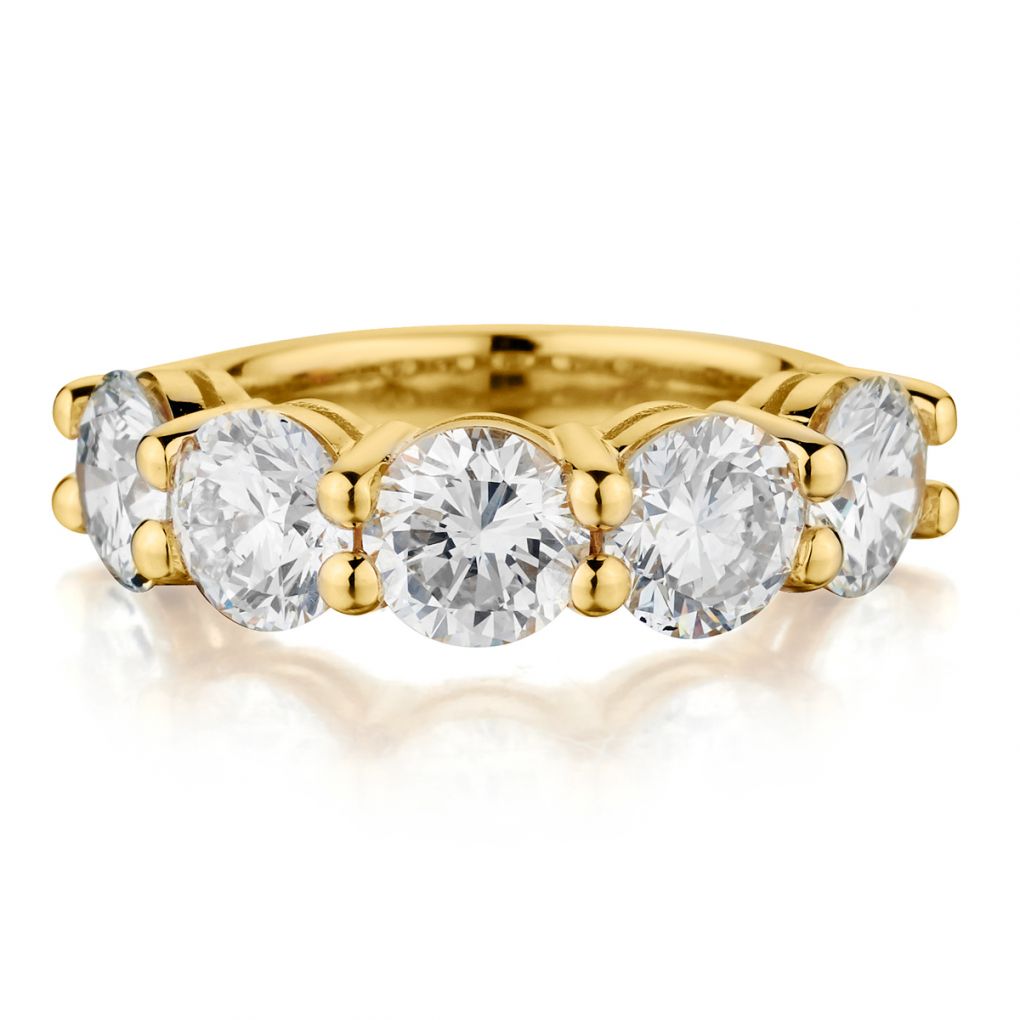 Ladies 18kt yellow gold diamond eternity band featuring 5 x 5.15 total carat weight of Brilliant cut diamonds of (VS-SI) in clarity and (G-H) in colour. (1.03 carat each). Half the way around. Shared claw setting. Current finger size 6.5. This ring can be resized.