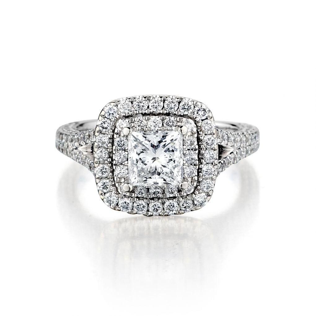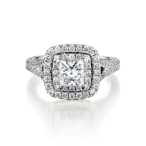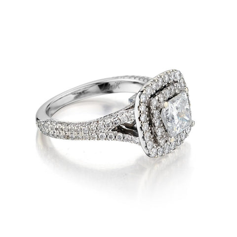 Beautiful Ladies 14kt white gold diamond ring designed by "Neil Lane" This ring features a Princess cut diamond weighing 1.01 carat weight of (I-1) in clarity and (G) in colour. This diamond is surrounded by a double row halo of Brilliant cut diamonds and diamonds on a split shank weighing 1.00 total carat weight.