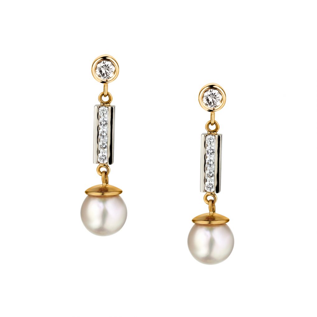 Ladies 18kt yellow gold Pearl and Diamond drop pendant earings . These earings feature a 9mm cream colored cultured pearl . Also featuring 0.80 total carat weight of Brilliant cut diamonds of (SI) in clarity and (G) in colour. Length of drop is 34mm. Post and butterfly closure.