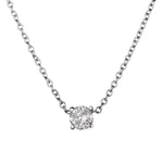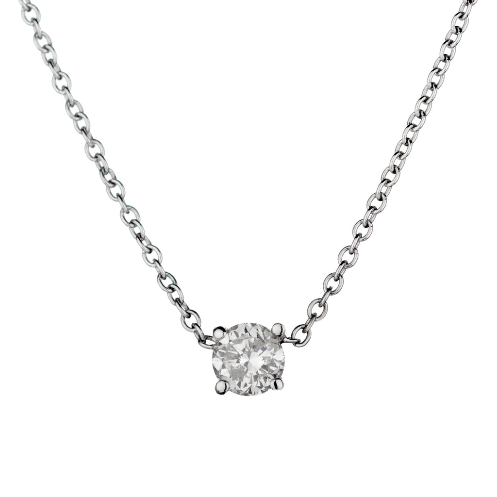 Ladies 18kt white gold diamond solitaire pendant featuring a natural Brilliant cut diamond weighing 0.68 carat weight of (I-1) in clarity and (K) in colour. 17" in length.