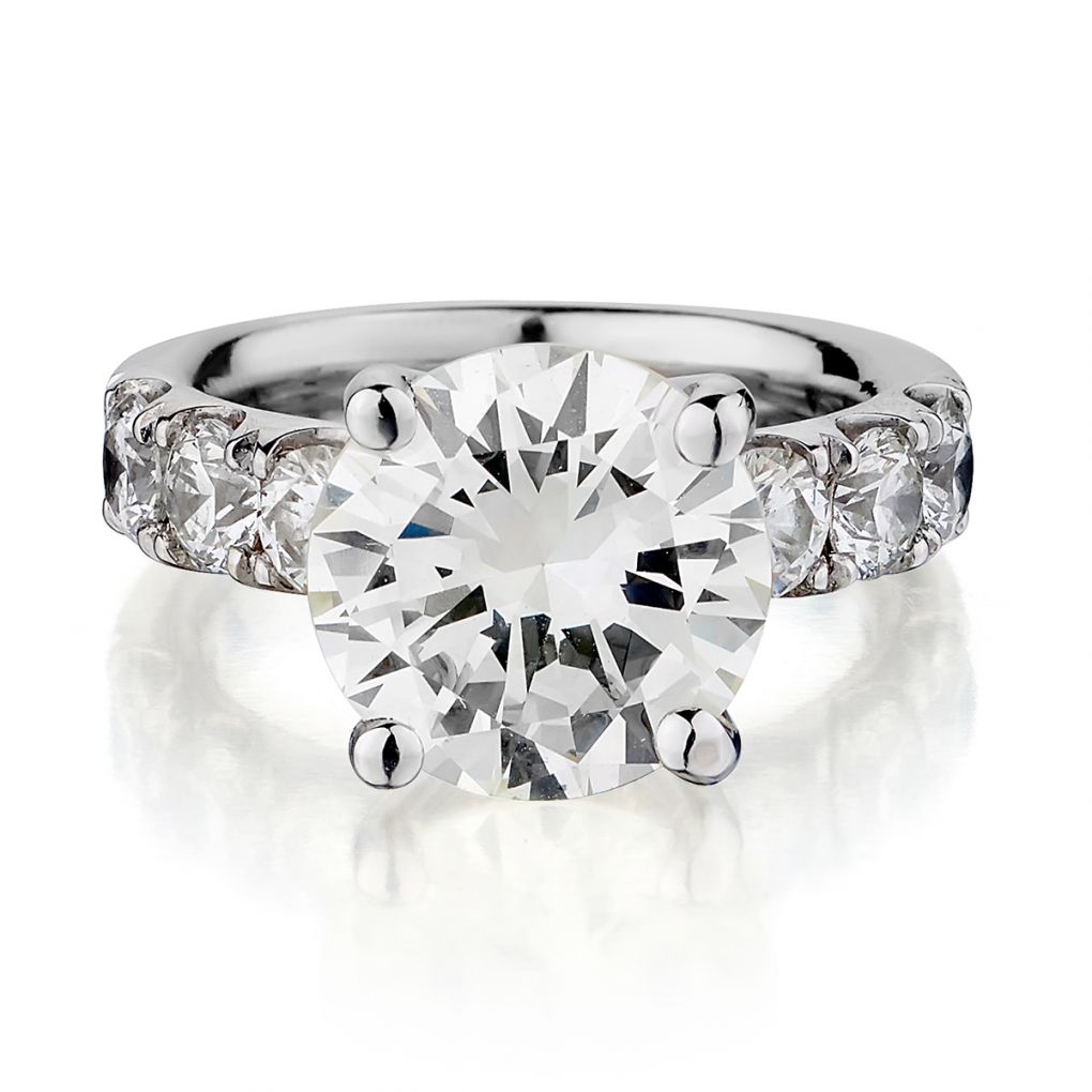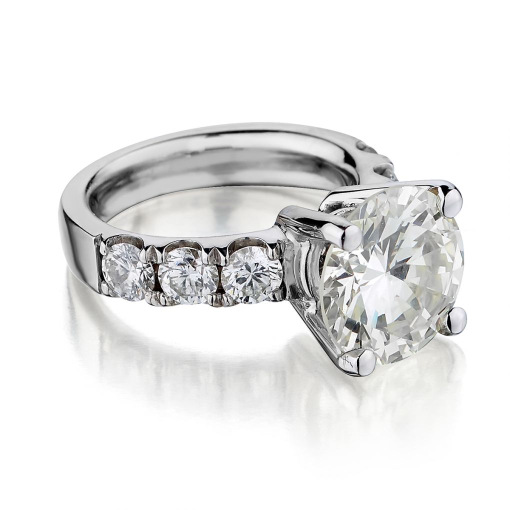 Ladies 18kt white gold diamond ring featuring a Brilliant cut diamond weighing 4.60 carat weight of (VVS) In clarity and (L) in colour. Also featuring 6 x 1.25 total carat weight of brilliant cut diamonds .(1/2 way around). Current finger size 5. This ring can be resized.
