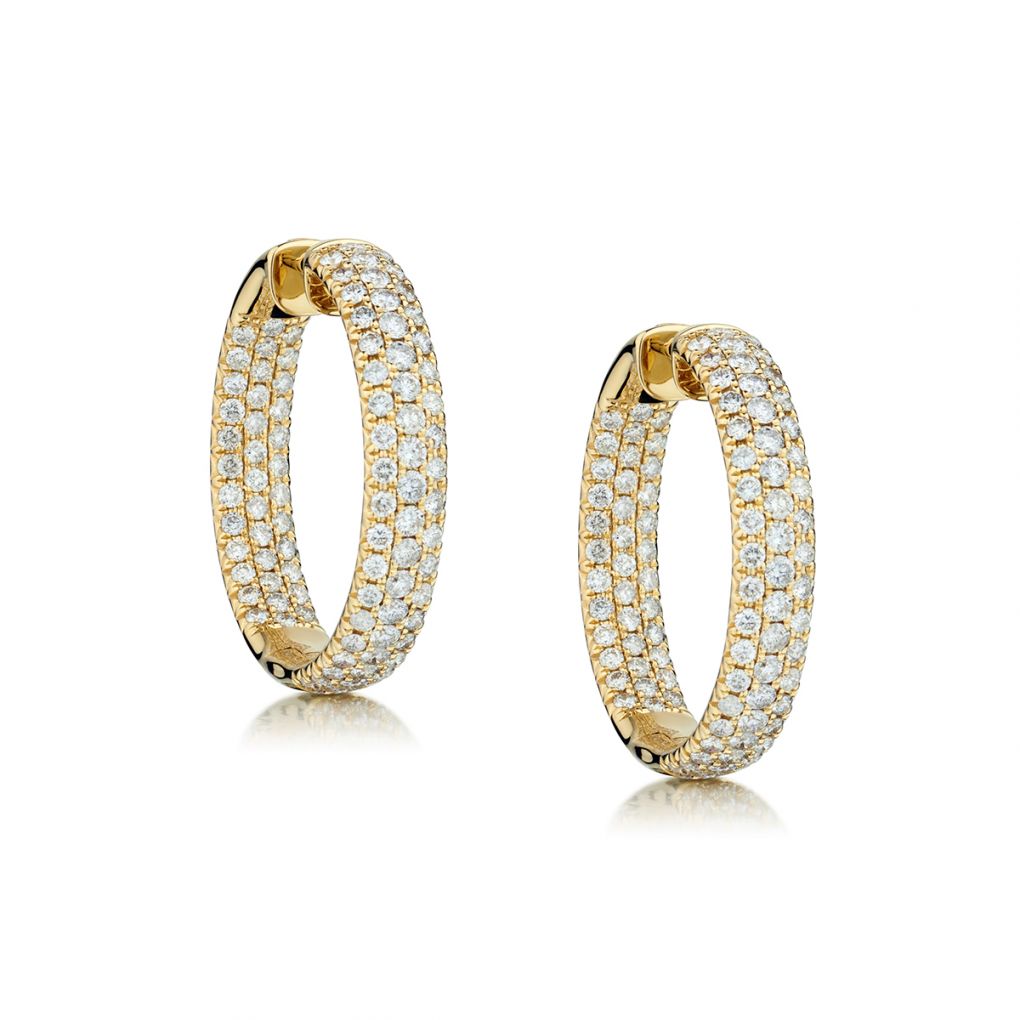 Ladies 18kt yellow gold diamond inside and out hoop earings. These earrings feature 5.00 total carat weight of Brilliant cut diamonds of (SI) in clarity and (G )in colour. Pave Diamonds feature on the front and on the inside. Inside diameter:24mm. Width:6mm.Weight:18.76 grams.