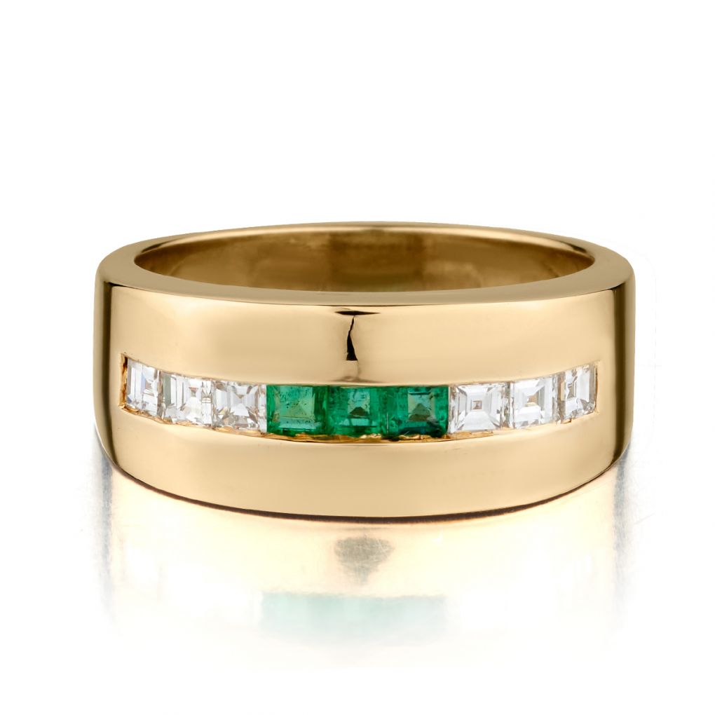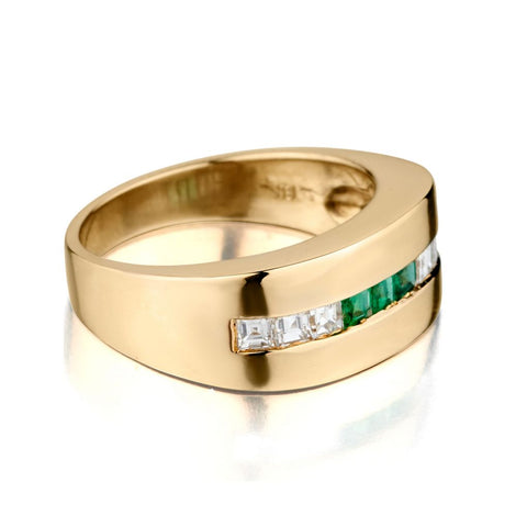 Unisex 18kt yellow gold Green Emerald and diamond band featuring 6 x 0.50ct total carat weight of square cut diamond of (VS) in clarity and (G) in colour. Also 3 x square cut green emeralds.Weight: 12.62 grams. Current size 9. This ring can be resized.