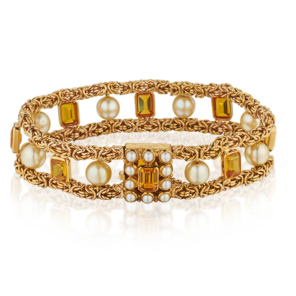 • Ladies 19k Y/G Unique Vintage Citrine and Pearl Bracelet. Weight: 50.28 grams.