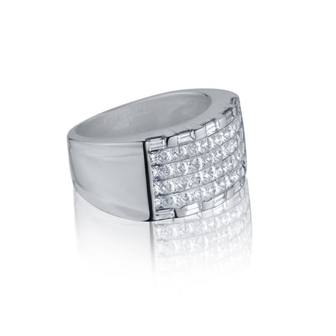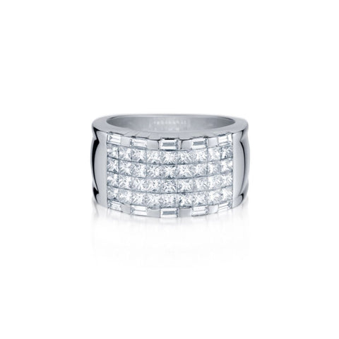 Ladies 18kt white and yellow gold diamond band featuring 1.01 total carat weight of Princess cut and baguette cut diamonds of (VS) in clarity and (I-J) in colour. Invisible setting. 11mm (W).Current finger size 6. This ring can be resized.