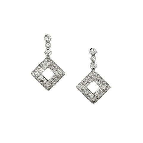 Ladies 18kt white gold diamond pendant/drop earrings featuring 1.75 total carat weight of Brilliant cut diamonds of (SI) in clarity and (G-H) in colour. Diamond are pave set. 29mm (L). Post and butterfly closure.