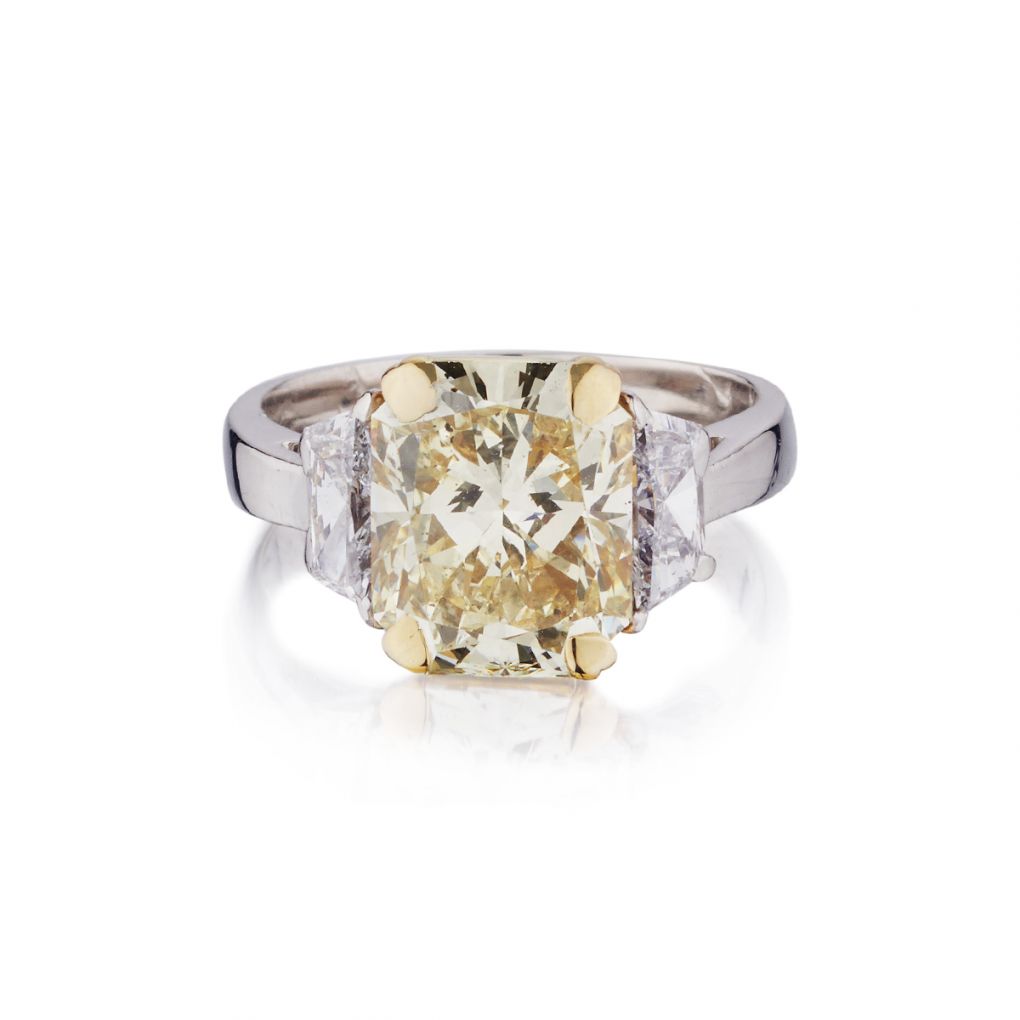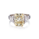 Ladies Platinum and Diamond ring featuring a Radiant cut diamonds weighing 5.40 carat weight of Fancy light yellow in colour and (SI-1) in clarity. Very good cut.The centre diamond is flanked by 2 x 0.64 total carat weight of Trapezoid diamonds of (D-E) in colour.and (SI-2) in clarity. Weight:7.7 grams. Current size 6-1/2. This ring can be resized.