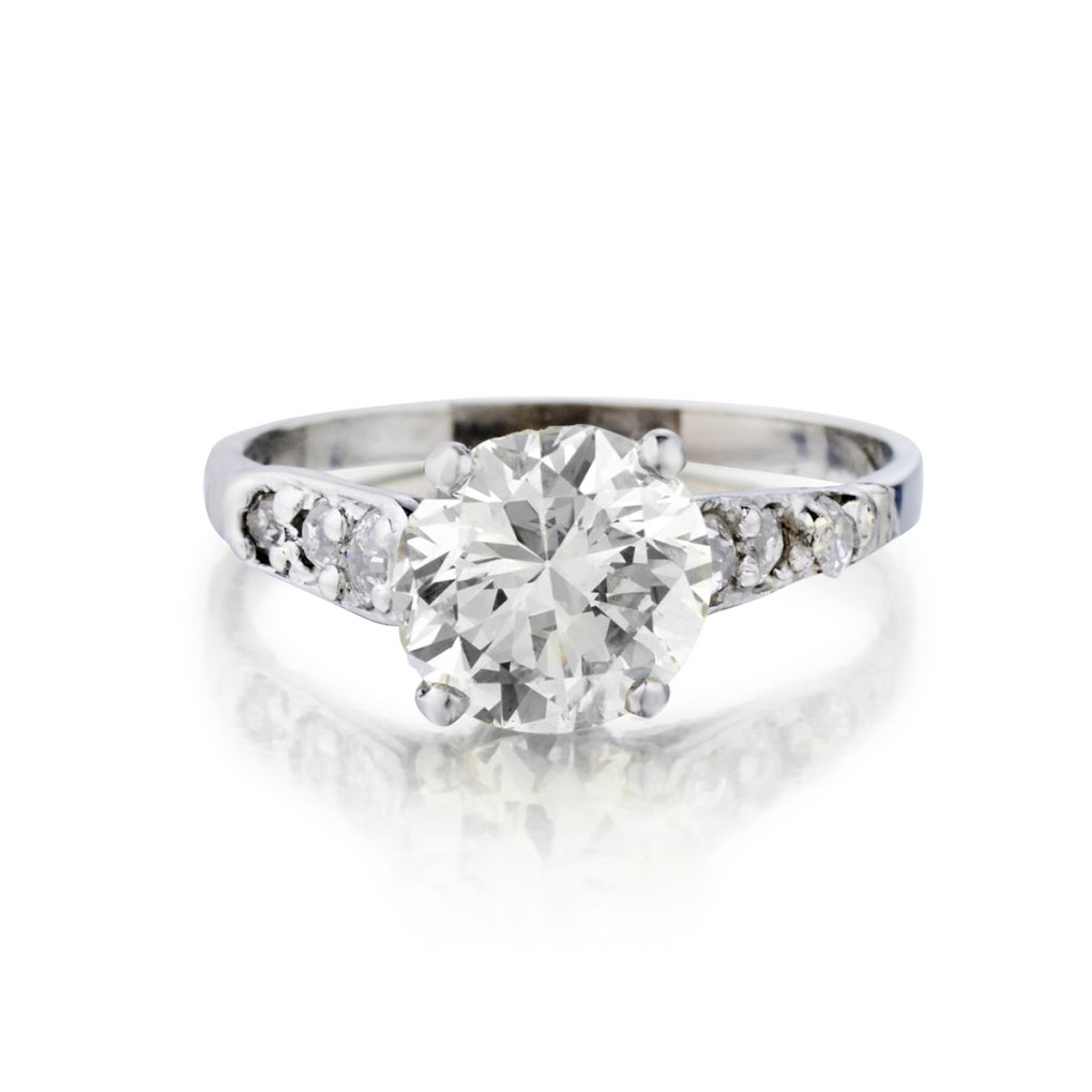 Ladies vintage 14kt white gold diamond ring featuring a European cut diamond weighing 1.70 carat weight of (SI) in clarity and (O-P) in colour. Sidestones:6 x 0.21 total carat weight of mine cut diamonds. Current finger size 6. This ring can be resized.