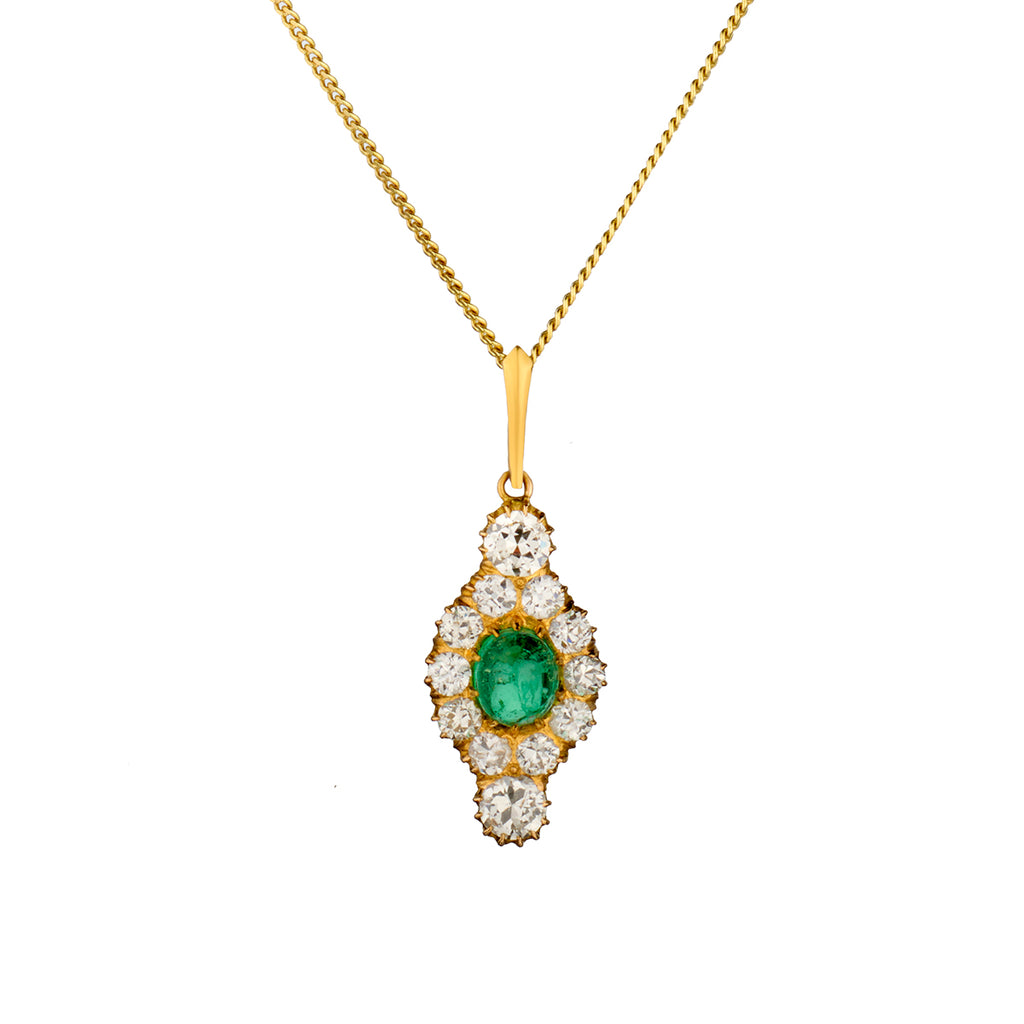 • Ladies Vintage 18kt Yellow Gold Green Emerald and Diamond Pendant. Circa 1890