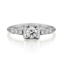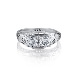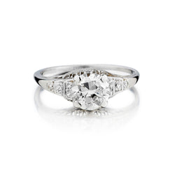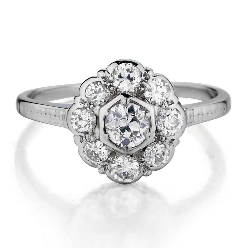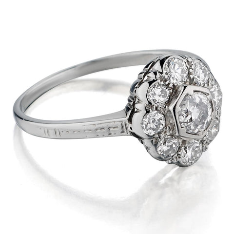 Ladies vintage 18kt white gold floral ring featuring 1.20 total carat weight of European cut diamonds of (SI-I-1) in clarity and (G-H) in colour. Circa 1950.Current size 61/2. This ring can be resized.