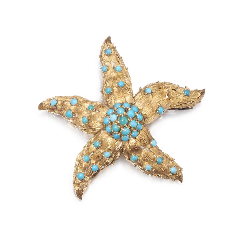 • Mid-Century 14KT Yellow Gold And Turquoise Starfish Brooch