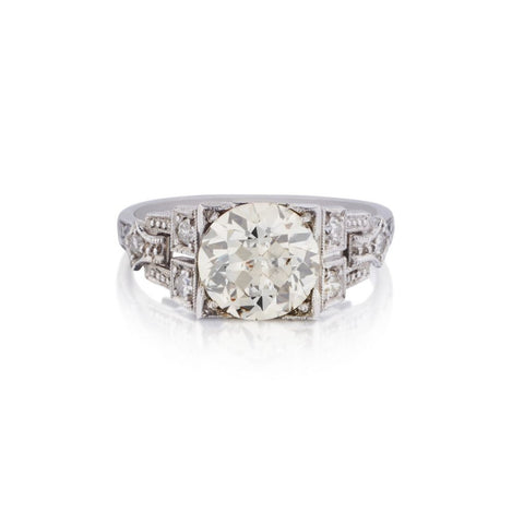 Ladies Mid-Century 14kt white gold diamond engagement ring featuring a 2.55 carat Old-European cut diamond of (VVS) in clarity and (L) in color. Also featuring 0.40 carat total weight of single-cut diamonds.Beautiful filigree detailing. Currently a finger size 7 1/2 but can be resized. Circa 1940 (+/-).