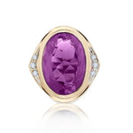 Modern Impressive 14kt yellow gold Amethyst and Diamond ring featuring an Oval Amethyst measuring approx. 20 carats in weight. This stone is bezel set. Also featuring 6 x 0.20 total carat weight of Brilliant cut diamonds. Ring measures 26mm x23mm. Current finger size 7-3/4. This ring can be resized.