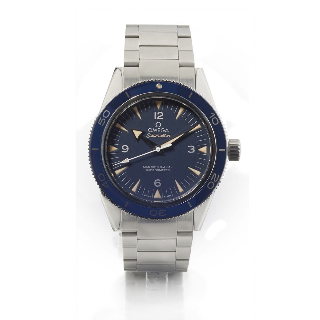 Gent's titanium Omega Seamaster 300 Master Co-Axial wristwatch with an integrated titanium bracelet. Uni-directional rotating blue ceramic-top bezel insert. Blue dial with luminous hands and index hour markers; arabic numerals at the 3, 6, 9 and 12 o'clock positions. Automatic movement; Omega caliber 8400. Sapphire crystal. Skeleton caseback. 41mm case diameter. Year 2015. Reference #: 23390412103001.