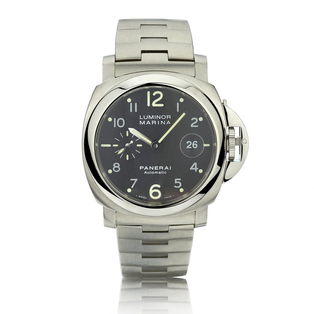 Gent's stainless steel Panerai Luminor Marina 44MM watch. Integrated stainless steel bracelet. Black dial with luminous stick markers. Sapphire crystal. Automatic movement. 44mm case diameter. Solid caseback. Year 2007. Reference #: Pam00164.