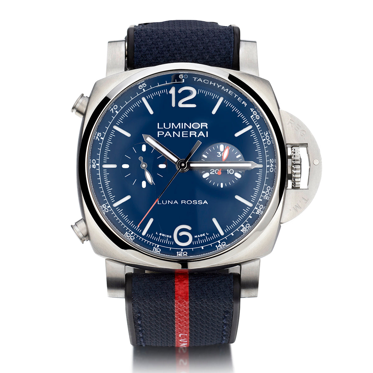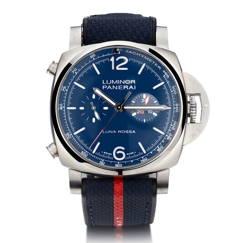 Panerai Luminor Luna Rossa chronograph in steel. Limited edition: 1000 pieces.  Blue and red textured strap with steel tang. 44mm x 16mm  case size. Blue dial with arabic numerals. Automatic movement. Calibre: 9200. Jewels: 41. Water resistance: 10 ATM. Power reserve: 42 hours. Sapphire crystal. Accompanied by a blue rubber band.  Reference number: PAM 01303. Circa: 2022.