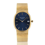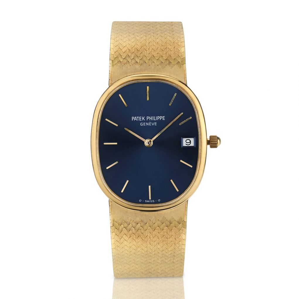 Patek Philippe Golden Ellipse in 18kt yellow gold. Integrated 18kt yellow gold mesh bracelet with beautiful polish finish.(custom)Blue dial. Date. Measurements: 32mm x 26.5mm x 5mm (thick). Quartz movement. Caliber:E23C. Sapphire crystal. Weight including movement:70 grams. Length:7 inches. Reference number:3788.