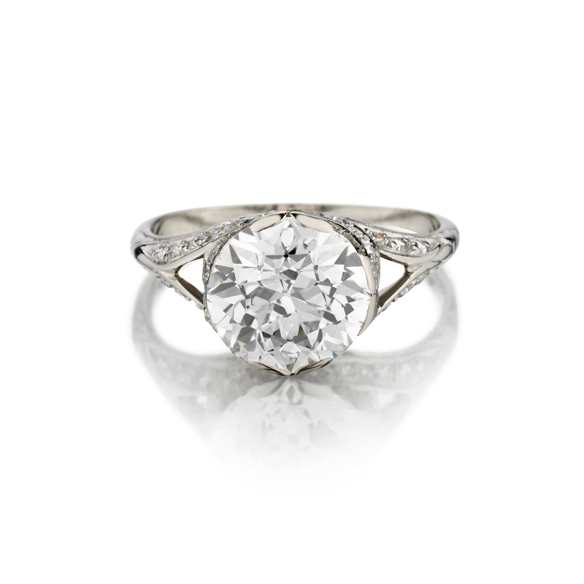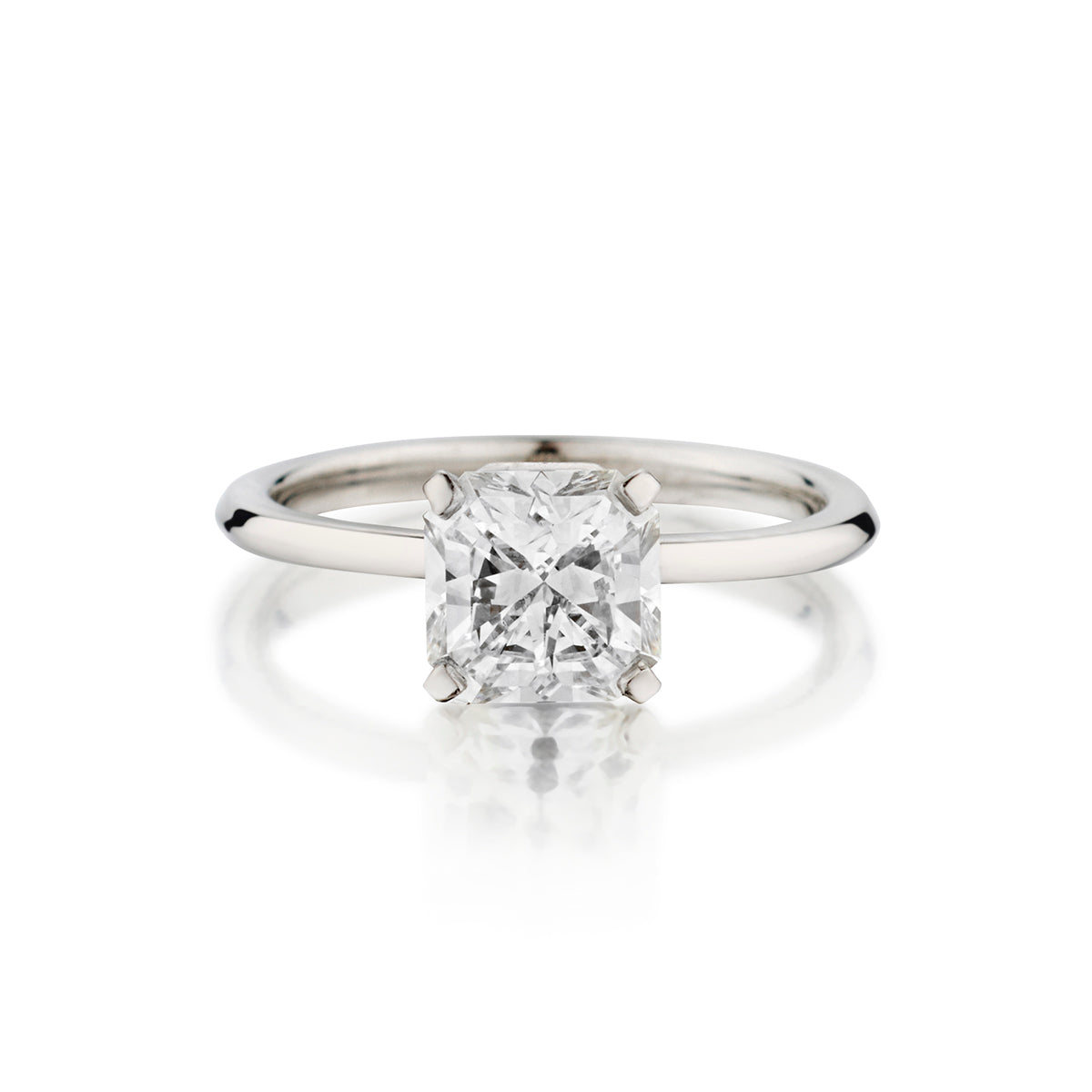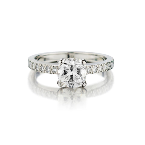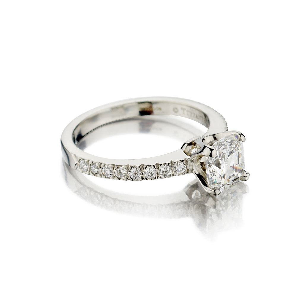 Ladies Platinum and Diamond Tiffany & Co ring. Novo Collection. This ring features a Cushion Brilliant cut diamond weighing 1.02 carat weight of (VS-1) in clarity and (E) in colour. On either side this diamond is adorned with 0.16 total carat weight of bead set Brilliant cut diamonds. Current finger size:4-3/4. This ring can be resized.