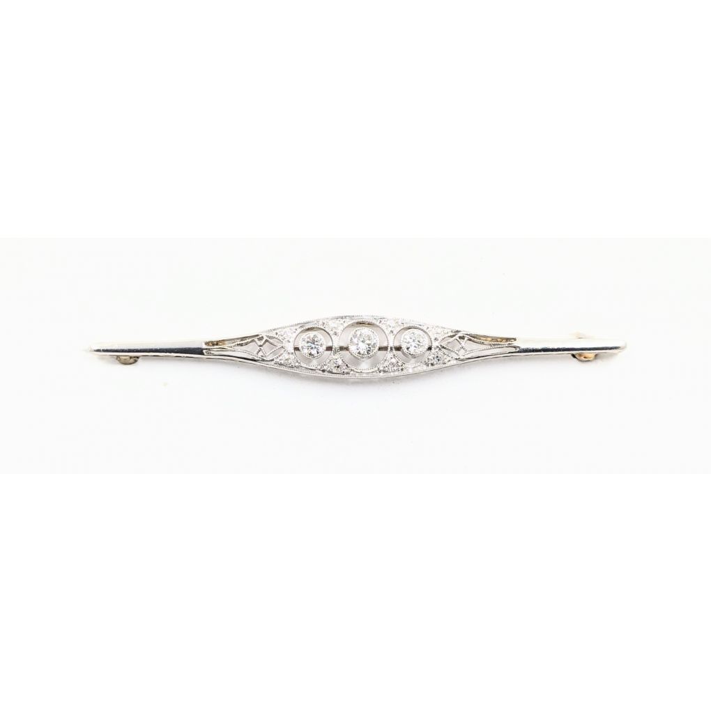Stunning platinum vintage linear brooch set with three mine cut diamonds in bezels totalling 0.60ct.There are eight small mine cut diamonds set into the brooch.