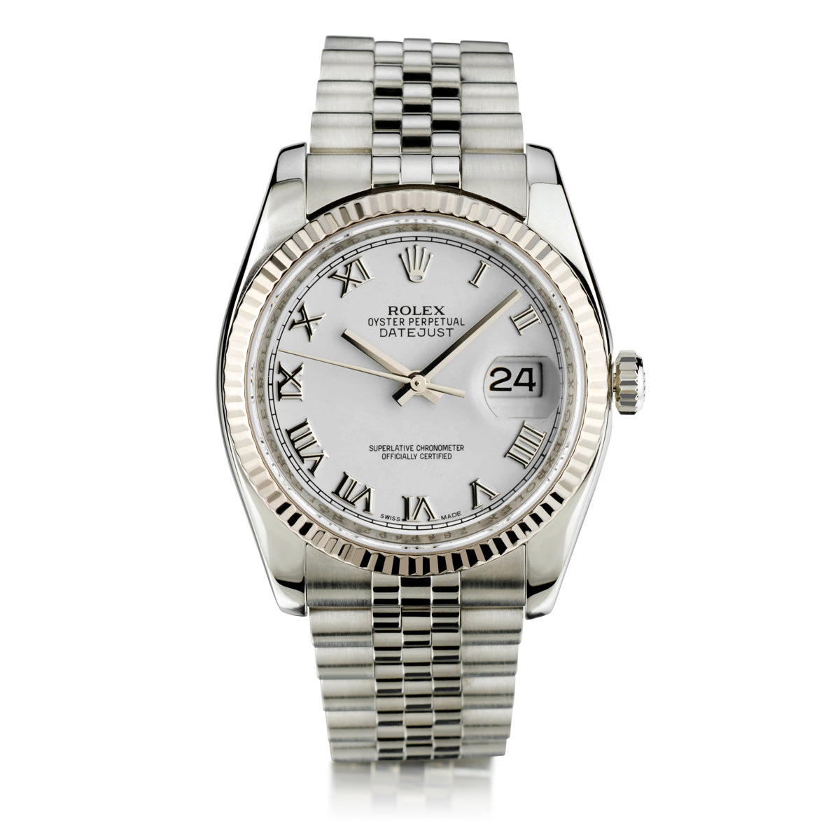 Rolex Datejust stainless steel wristwatch. Integrated stainless steel jubilee fold over  bracelet.36mm case size. 18kt white gold fluted bezel. White dial with black Roman numerals. Date. Automatic movement.  Sapphire crystal. Circa 2008. Reference number: 116234.