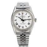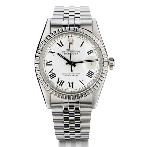 Rolex Datejust stainless steel wristwatch. Integrated stainless steel jubilee bracelet. White dial with black Roman numerals. Date. Automatic movement. Caliber:1570. Plexiglass crystal.Circa 1983. Reference number: 1601.