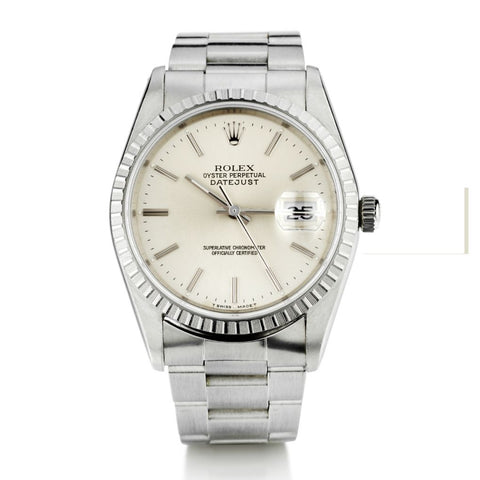 Rolex Datejust in stainless steel. Stainless steel oyster bracelet. Stainless steel bezel. Silver dial. 36mm case size. Date. Automatic movement. Calibre:3135. Power reserve:48 hours. Circa 1991. Reference number:16220.