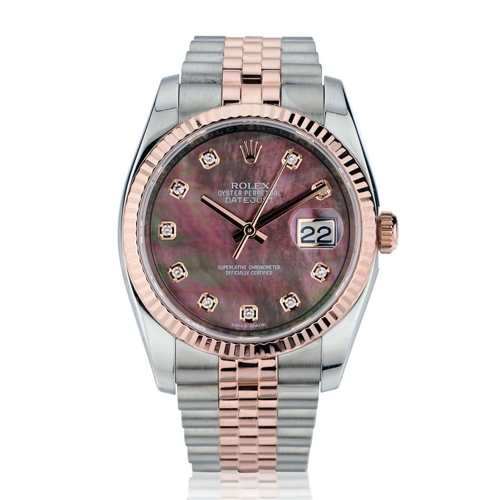 Rolex steel and 18kt rose gold Datejust wristwatch. Mother of Pearl diamond dial.36mm case size.Steel and 18kt rose gold jubilee bracelet with fold over clasp.Automatic movement. Scrambled numbers. Reference # 116231